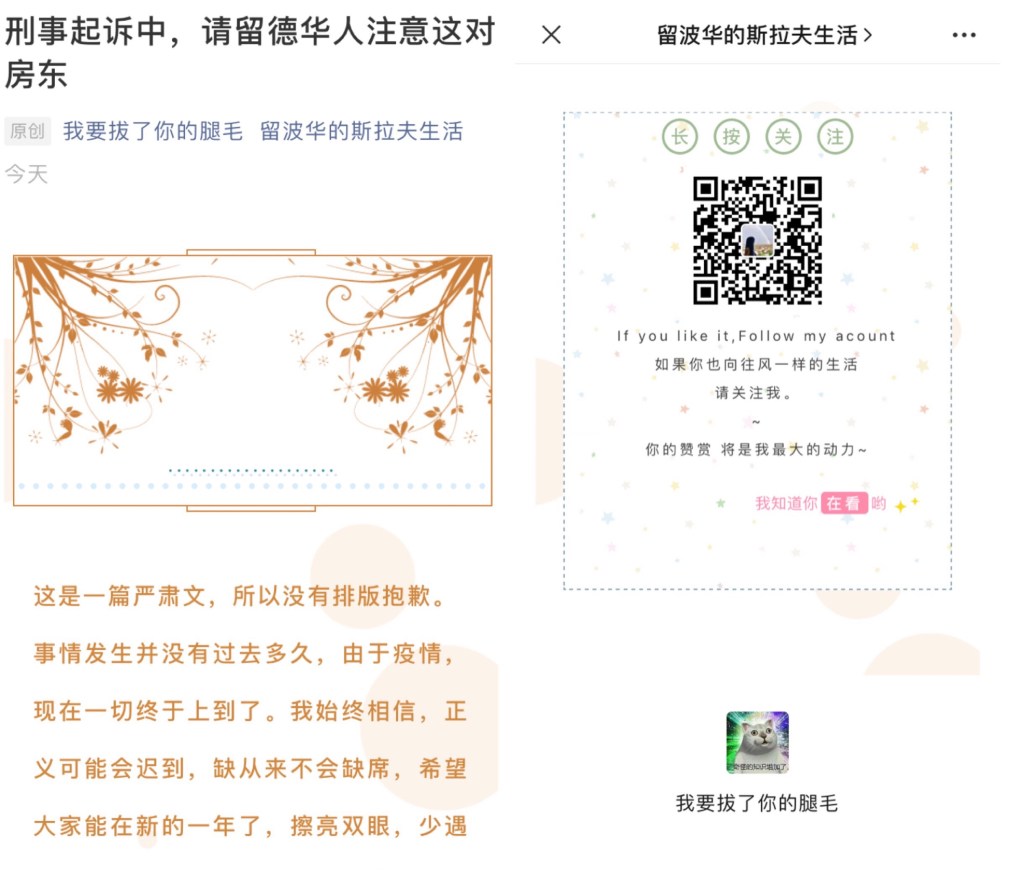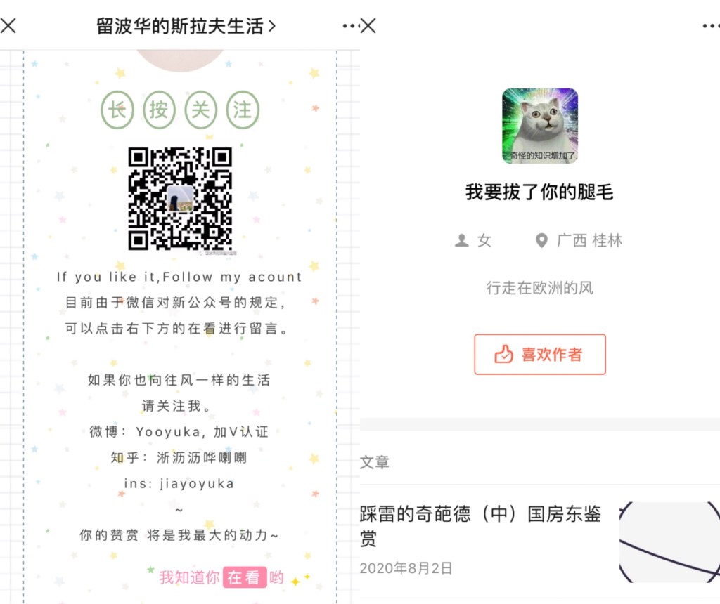 写文章辱华的腿毛女(以下简称腿毛),微信名:你压到我腿毛了/我要拔了你的腿毛,其公众号《留波华的斯拉夫生活》,微博名:Yooyuka, ins: jiayoyuka。 从其自媒体和其同学提供的信息得知:腿毛,真名尤佳,1994年8月8日出生于广西桂林,留学波兰,后窜至汉堡自费商学院ISM,自诩“行走在欧洲的风”,津津乐道并大肆炫耀自己是拔人腿毛和被人压腿毛的专业人士。