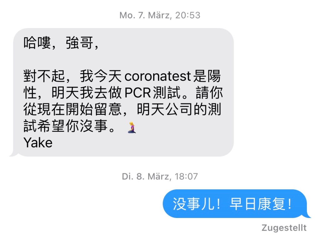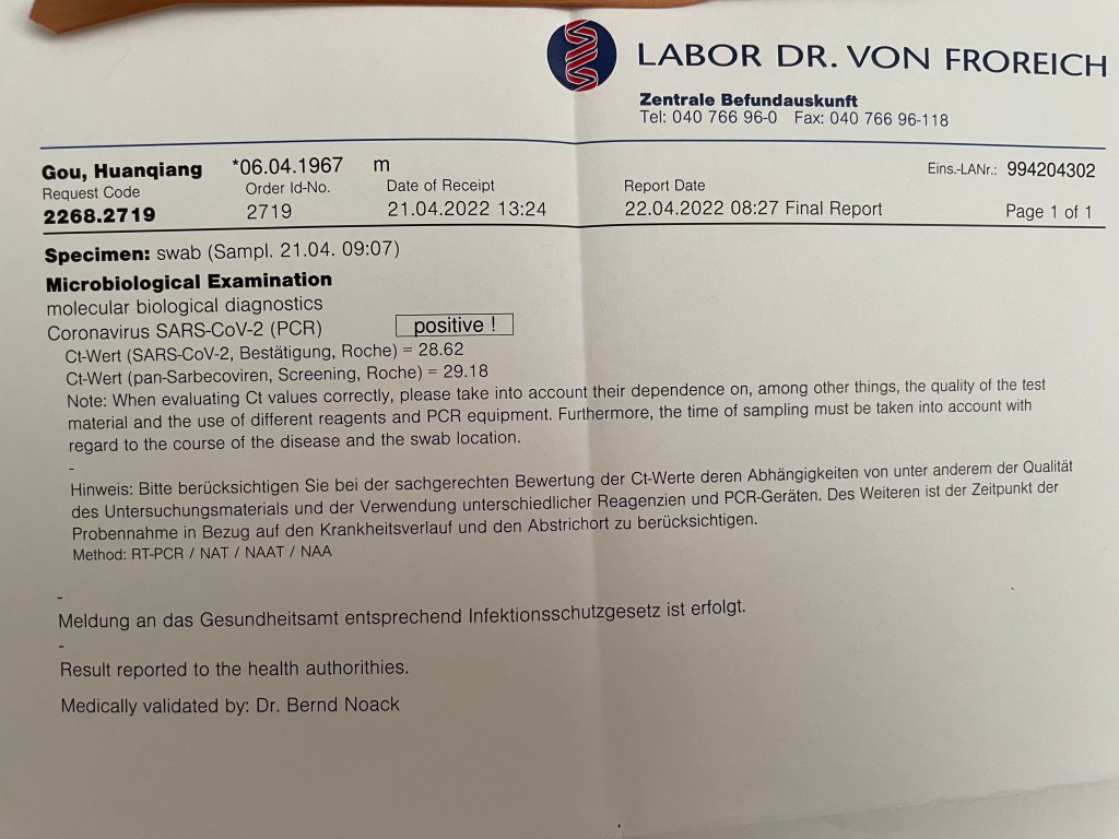 新冠不是病,得上很要命 Huanqiang Gou 未分类 2022年4月29日2022年7月26日 1 Minute ——兼作感染Coronavirus 治癒及康復指南(持續更新一年) Coronavirus 在世界範圍內肆虐三年多了,我在德國的復活節假期里在自己家裡終於確診陽性了。 最初的新冠,被無端滴渲染成了殺人魔,一觸即死,甚至不能說它,一說也是必死無疑,令整個世界瞠目結舌的是,武漢的李醫生就是因為說了它一下而亡。 起初我也被嚇住了,乖乖滴停下騎行南半球的宏大計劃。顧不上疫苗陰謀論如何猖獗一時,連打三針BioNTech 疫苗,以為從此無憂也。 這得感謝孫二娘指點迷津,這位擅長做包子的妹子因為疫情緣故,跑去鄰居的診所幫忙看診,我遂成了醫務人員家屬,於是乎順理成章滴沾了一下疫苗的光。 仗著自己3G了,不再擔心染毒了,毫無顧忌滴陪著鄰居老人滿漢堡轉悠吃海鮮大餐。彼時漢堡的飯店只允許3G入內,還要驗明正身呢。 直到有一天我一個辦公室的同事告訴我,他陽性了,我是密接者,中招的可能性大增。公司只是一味滴照例快篩,根本不慮及員工死活,讓我直接換位到陽性同事的位置續工。從那時起,我開始每天早晨上班前自測一下,確保不會因為我而傳染給其他人。 我工作的公司是台資的,部分員工一直在Home Office;按照當時台灣的防疫政策,我本應回家隔離觀察的。但受制於工種,我是必須按點上下班的,每天處理來自歐洲各國客戶退回公司的維修產品。說白了,我就是一廉價勞動力,乾最髒最重最累的活兒,拿最低薪水的可憐人兒。 但奇了怪了,我身邊的同事都陽性了,甚至孫二娘也陽了,我卻遲遲不陽,安然無恙! 於是想起英國那個著名的新冠實驗:英國招募了36名沒打過新冠疫苗,健康且免疫力較好的年輕人,將病毒注入鼻子,居然有17人沒被感染!我暗自慶幸一貫年輕態的自己就是這種特殊人才吧。 孫二娘大約十天後所有症狀消失,陽過的同事們也都還陰了,沒有人因為這個病毒有任何生命危險的跡象,歐洲有些國家也陸續開放,視病毒如無物。這還算是病毒嗎? 四月十二日,再有三天我就工作滿一年了,按當初面試的HR承諾,我應該簽下一個「美麗的合同」,當天我感覺憋氣,需要時不時長吁一口氣補足血液里的氧氣。自測快篩,我陰性。或許是昨天穿短袖騎車搞得一身臭汗,有點兒小感冒吧。 四月十三日,在公司餐廳獨自吃午餐,感覺食慾不高;即使中途HR進來,滿口答應我,以後每年會給我加點兒薪水,一下子把偌大一個餅畫到了月球上,仍舊沒有提振我沮喪的食慾。當天自測快篩陰性。 四月十四日上午,自測快篩陰性,破天荒滴半天時間喝光兩大茶壺熱水,仍舊口渴!下班時,感覺嗓子眼兒異樣,欲咳又止。 四月十五日,德國復活節假期第一天,嗓子眼稍癢,輕微咳嗽,感冒症狀明顯。自測快篩依舊陰性,因為肺部毫無異常,自覺平安無事兒。但孫二娘堅信不疑,我中毒了!遂電話預約了翌日檢測中心的PCR以求真相大白。 四月十六日孫二娘陪我去檢測中心,此時檢測中心的PCR政策已做調整,只有快篩陽性者才有資格進行PCR檢測,政府也是為了省錢嘛。快篩陰性,又何須脫褲子放屁,再去費時費力滴PCR呢。 檢測中心的檢測結果依然陰性!也就是說,即使你感染了病毒,症狀不重,也不足以測出你的陽性!問題出在哪裡?要麼檢測設備,要麼檢測方法,要麼病毒智慧隱身?嘿嘿,一切皆有可能昂。 四月十七日咳嗽加重痰量明顯渾身乏力,病毒開始發威了吧。再來一次自測快篩吧,終於等到了激動人心的那一刻:看著慢慢顯出來的紅色槓槓,我的那顆懸著的心放下了!技術意義上,我陽了!這個陽,來的太不容易了,也太不是時候了!這不是糟蹋了我的假期了嘛…… 插播新冠小知識,疫情期間容易混淆各種不同病種的症狀。但經驗值得借鑒,此時此刻,你以為的感冒,一般情況下皆是Omicron感染,也有可能前者是因,後者是果。家裡的年輕人感染後,最初的三四天裡快篩自測都是陰性,只有在症狀明顯加重的情況下,才能自測顯陽。 新冠很嚴肅,應當小心防範,但是…..快篩檢測:一個外表貌似健康的人,你捅他鼻孔兒,捅他嗓子眼兒,甚至捅他屁眼兒,有用嗎?有個屁用!那為何還要一個勁兒滴捅捅捅呢?更有甚者,封屋封樓封城封市,全民皆捅!捅你媽的錢眼兒。 四月十八日,我的喉嚨開始出現腫痛,咳嗽加重,因為血氧量含量偏差,乏力明顯,不想動,只想躺臥逗狗。家庭醫生送來祛痰神藥ACC泡騰片。 貌似Omicron無藥可醫,只能靠自身免疫力對抗之。所幸Omicron相比較上一代的Delta更顯溫柔敦厚,歐美的科學家驚奇滴發現,Omicron只感染上呼吸道!因感染它而產生的自然免疫,又可抵御其它可感染肺部的病毒變種。所以歐美國家認為,這是上天賜給人類群體免疫的最佳時機:全面放開,親吻病毒吧! 歐洲沒有蓮花清瘟,為了緩解喉嚨腫疼,德國有很多非處方草本含片,這款櫻桃味道的含片效果明顯。 我奉獻大家一個戰勝病毒的獨家秘方:雙盤拉伸。這並非獨門絕技,床頭桌旁,人人可做。我是被郭蓉娘醍醐灌頂才茅塞頓開的。感興趣的同学不妨一試。 四月二十一日,家庭醫生喊我到診所,給我安排了PCR檢測,以決定是否給我開出第二張請假條。德國的病假條一式幾份,給公司和保險公司及本人各一份。通常病假期間的薪水由保險公司全額支付。 糟糕的是,我依然陽性,CT值28.5依舊具有傳染性,不得不再休一周。我的呼吸道症狀一天天好轉。事實上,陽性不可怕,可怕的是清零! 