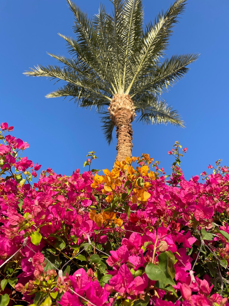 值得一提的是当地的绿植盆栽,颇为称道。除了高大的椰枣树这个群体夺人眼球,各式不知名的花儿,盘踞在楼前屋后,争相多艳,给这座城市增添了无限生机和活力。