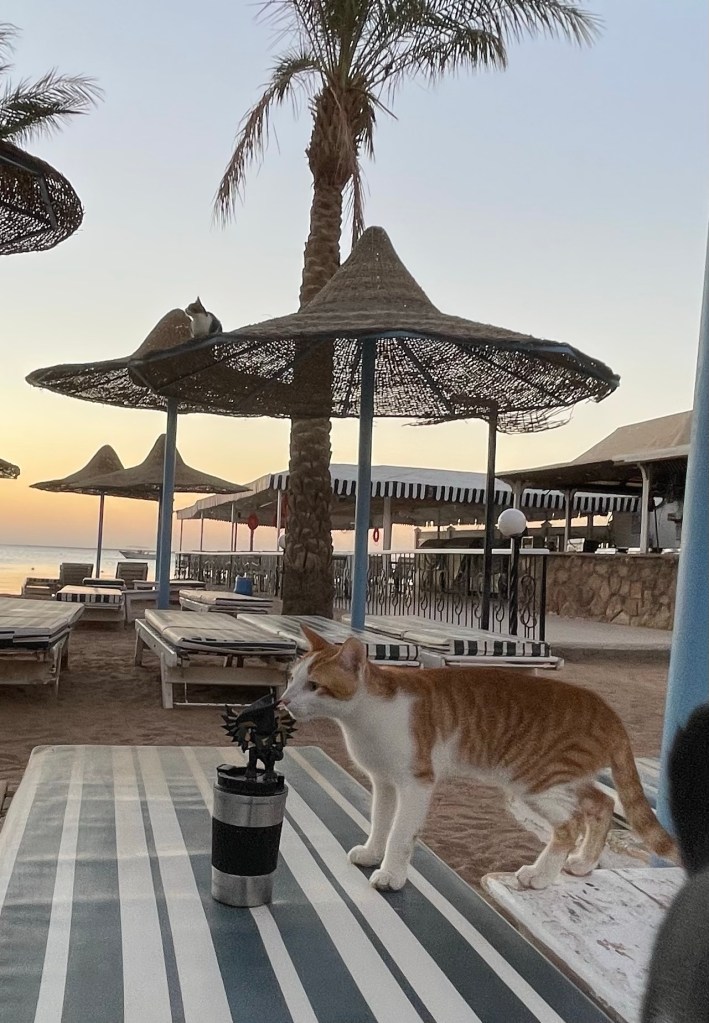猫,是埃及众神的化身之一。埃及关于猫的传说和神话数不胜数。鉴于猫在埃及的特殊地位,埃及的猫,就像印度的老鼠一样,有着特别的待遇或者是礼遇吧。酒店有专门为猫设计的猫窝,定时有专人投放猫粮。酒店电梯门前也是猫神守护进出。猫身上的Horus之眼,发人深省呐。